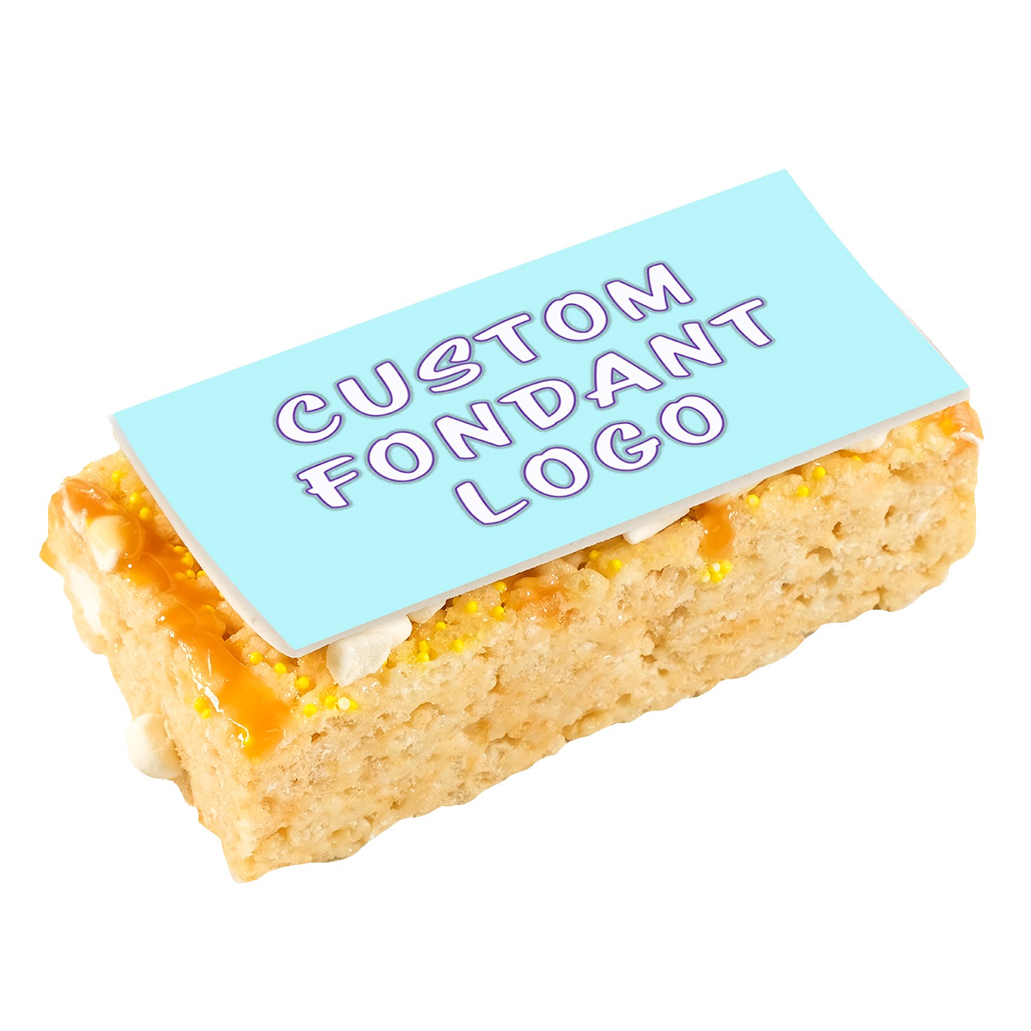 A 2″ x 4″ handmade marshmallow crispy rice bar, individually wrapped and topped with a custom fondant logo. Choose flavors and sprinkle colors for a premium branded treat perfect for giveaways, events, or mailers.