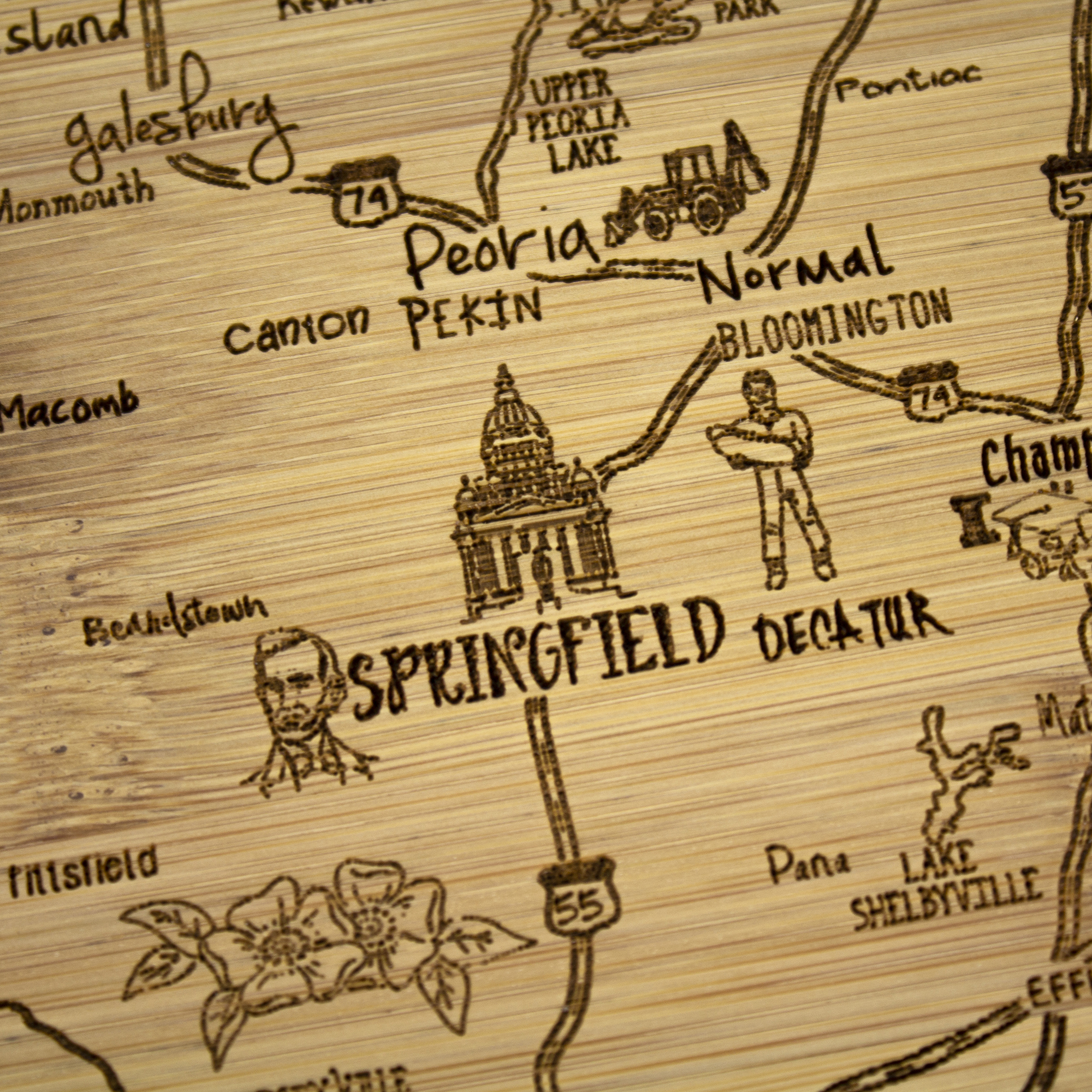 Savor a slice of this State with this beautiful bamboo serving and cutting board with artwork inspired by its cities, places and people. Fun, whimsical artwork features many of the wonderful sights and places. Beautiful flat grain bamboo, laser etched side serves as an ideal serving platter and the reverse smooth side is a great cutting surface; It’s friendly on knives and hand wash only. Bamboo is better for the environment; Moso® bamboo is incredibly durable. Complies with Prop 65. 11″ W x 8 3/4″ H x 1/2″ Thick