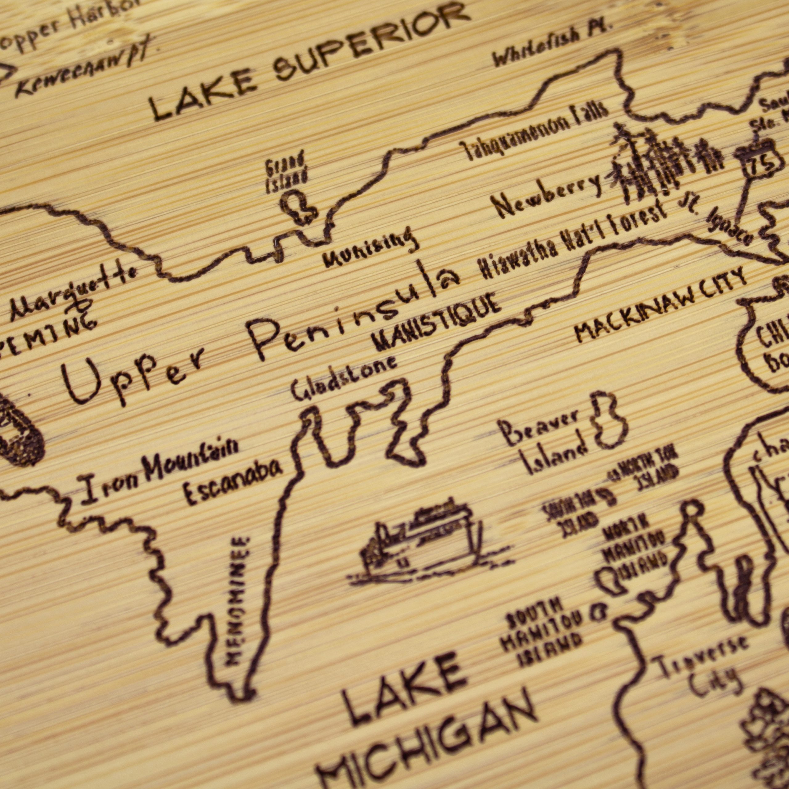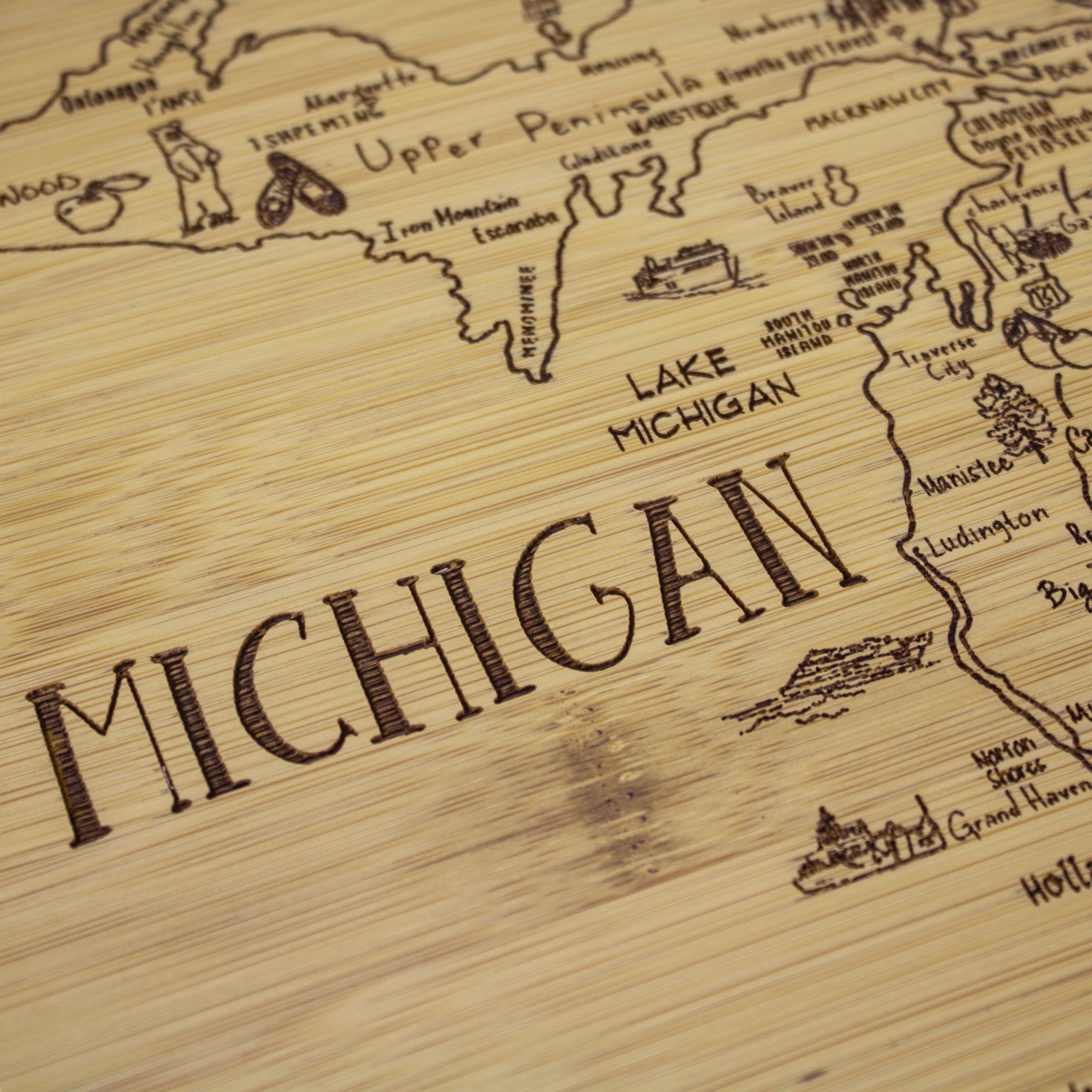 Savor a slice of this state with this beautiful bamboo serving and cutting board with artwork inspired by its cities, places and people. Fun, whimsical artwork features many of the wonderful sights and places. Beautiful flat grain bamboo, laser etched side serves as an ideal serving platter and the reverse smooth side is a great cutting surface; It’s friendly on knives and hand wash only. Bamboo is better for the environment; Moso® bamboo is incredibly durable. Complies with Prop 65. 11″ W x 8 3/4″ H x 1/2″ Thick