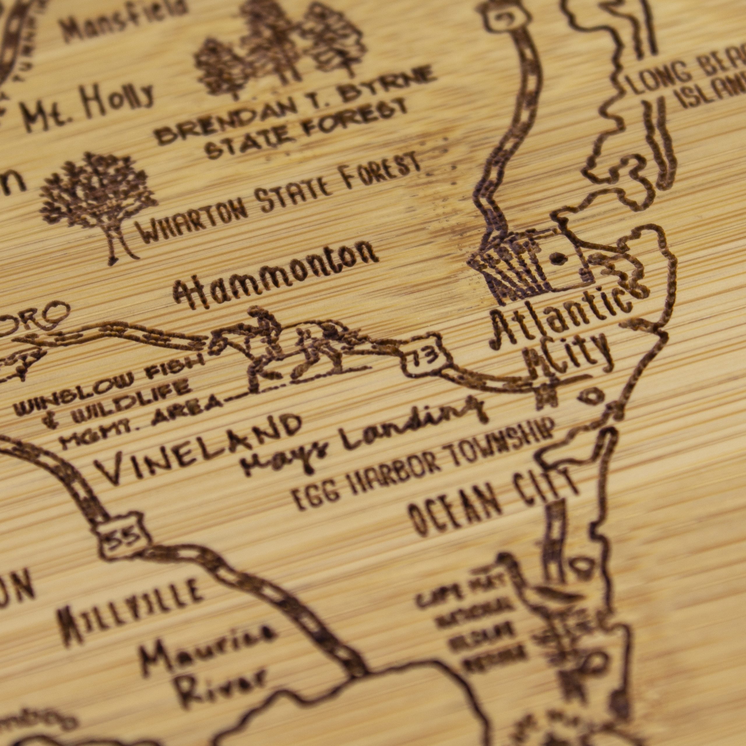 Savor a slice of this State with this beautiful bamboo serving and cutting board with artwork inspired by its cities, places and people. Fun, whimsical artwork features many of the wonderful sights and places. Beautiful flat grain bamboo, laser etched side serves as an ideal serving platter and the reverse smooth side is a great cutting surface; It’s friendly on knives and hand wash only. Bamboo is better for the environment; Moso® bamboo is incredibly durable. Complies with Prop 65. 11″ W x 8 3/4″ H x 1/2″ Thick