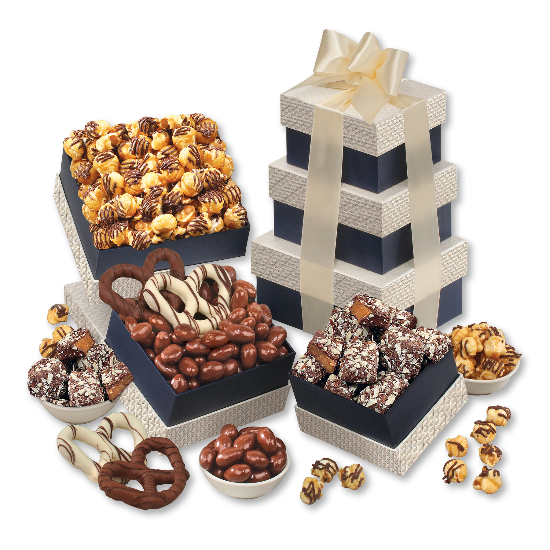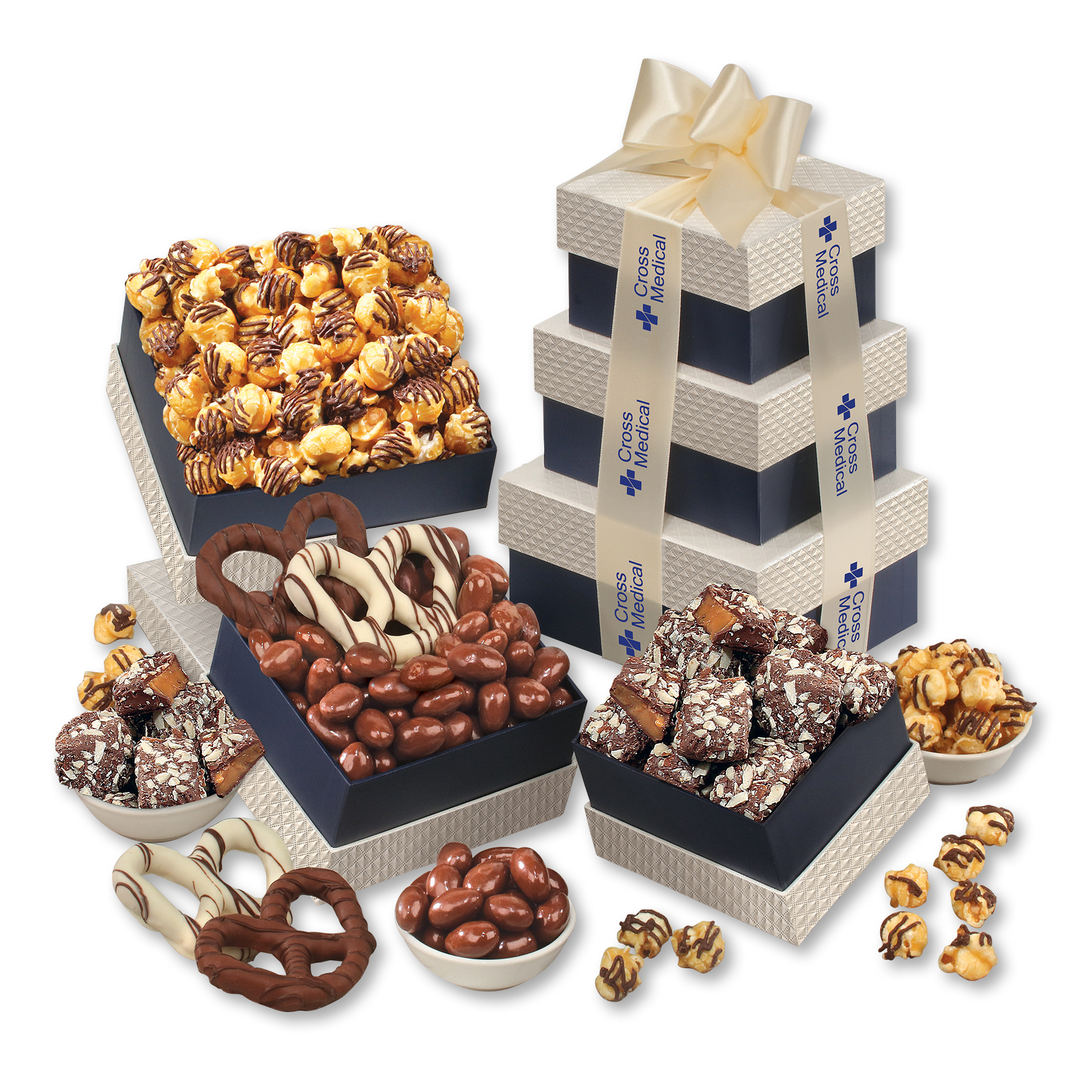 There is no such thing as too much chocolate, and this classic tower proves the point! Its three navy and pearl boxes are stuffed with four gourmet chocolates to delight any connoisseur. We tie it all together with ivory satin ribbon foil-stamped with your logo in your choice of color for a gift that will leave a delicious lasting impression. Complies with CPSIA, FDA, Prop 65. 6″ L x 5″ W x 8.5″ H