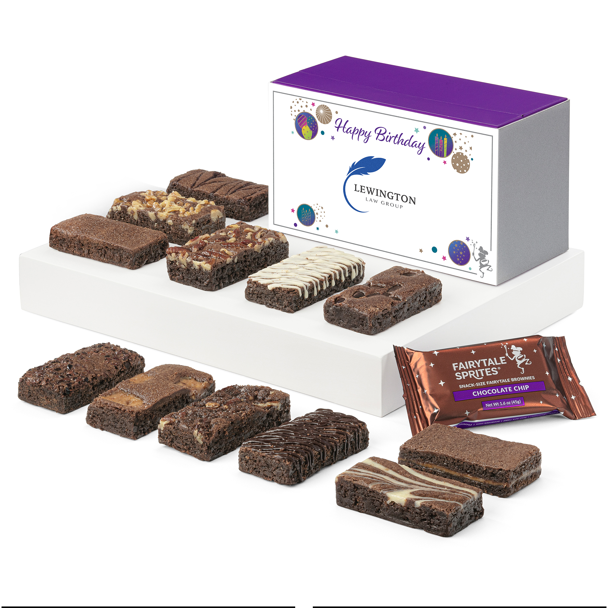 Amaze them with a gourmet birthday gift of a dozen snack-size Fairytale Sprites. Baked with all-natural ingredients of the finest quality, these dark chocolate brownies come in 12 unique flavors so they can try them all!Arrives birthday-ready in a celebratory Birthday band, personalized with your full-color image. Complies with OK. 7 3/8″ L x 4 3/8″ W x 3 3/8″ H