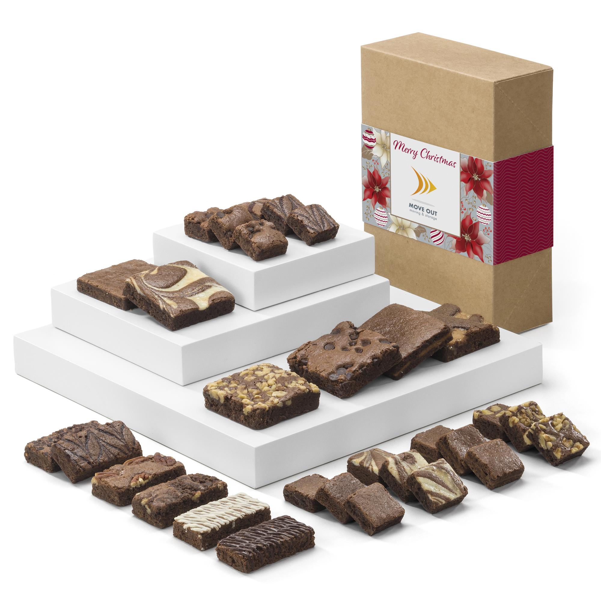 The Deluxe Medley will not disappoint with six full-sized brownies, six snack-sized brownies, and 18 bite-sized brownies – all individually wrapped for freshness. All this gourmet goodness is wrapped with a Merry Christmas band proudly presenting your full-color logo. Certified kosher for dairy. 10 3/4″ L x 7 3/8″ W x 3 3/8″ H