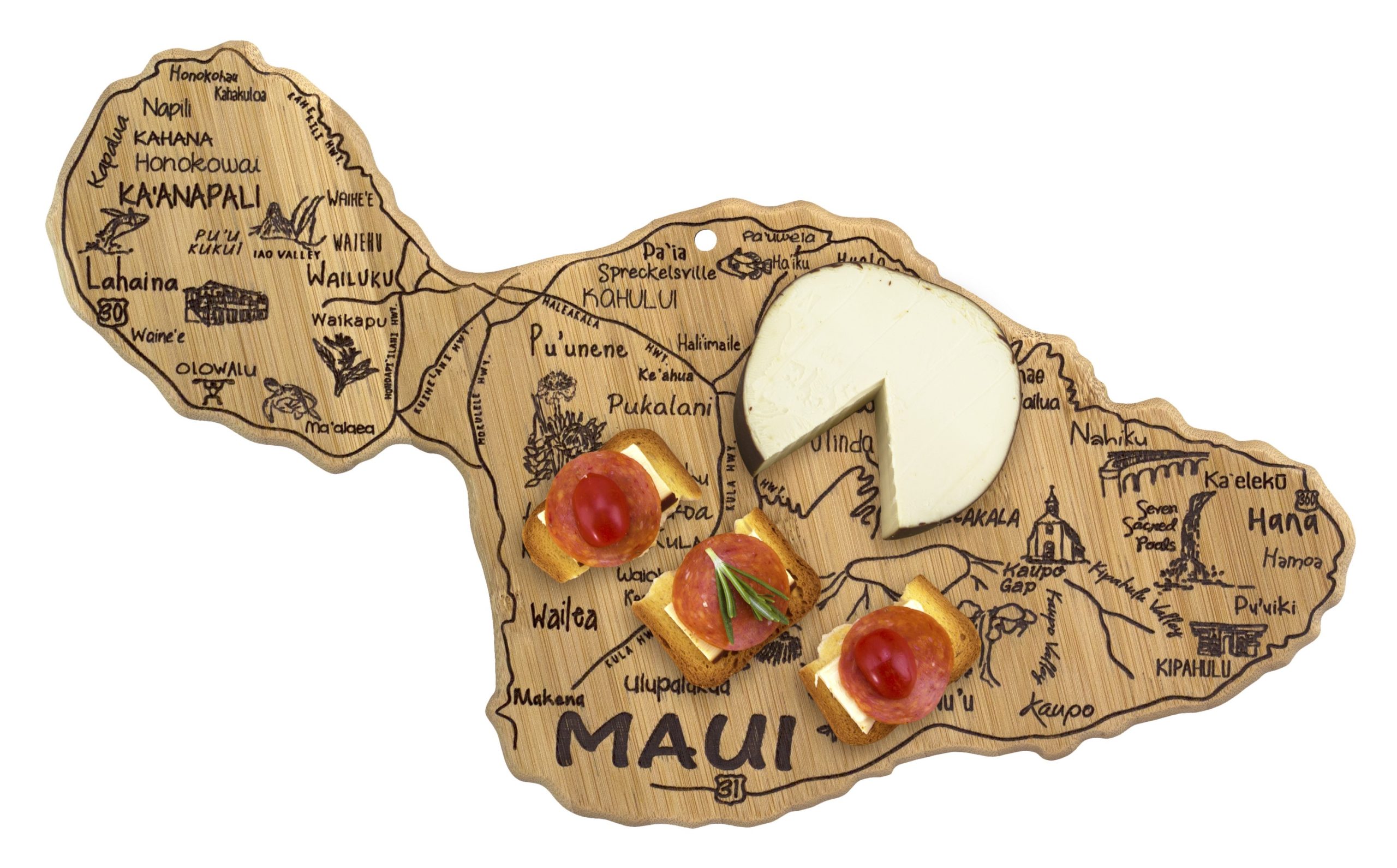 The Destination Series highlights the unique flavor and experiences of every state. The fun, laser-engraved artwork calls out the towns, places and attractions that make each place special. These versatile boards work well as a serving board, a cutting surface or hanging as wall decor with the included hang tie. The line includes every US state, the Hawaiian Islands, Mexico and several Canadian provinces. Boards can be further engraved on the back with a logo. Complies with Prop 65. 15 1/2″ W x 9 1/8″ H x 5/8″ D