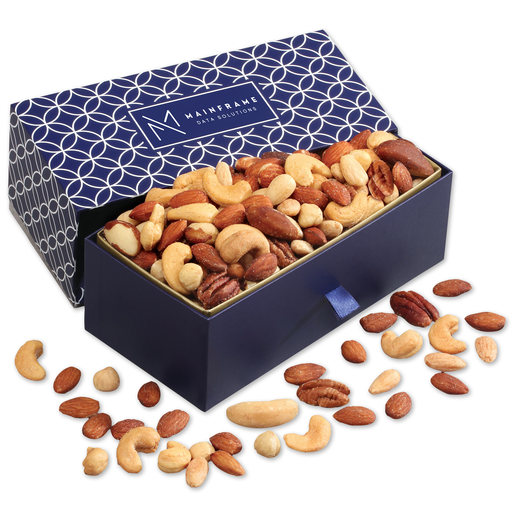 Equally attractive for an office or home, this navy and white patterned drawer box is sure to be used again and again! Pull open the drawer by its ribbon tab to reveal fresh-roasted deluxe mixed nuts, three-quarters of a pound. For the final touch, we imprint the top of the box with your logo in your choice of color for an impression your recipients won’t soon forget. Complies with CPSIA, FDA, Prop 65. 7.5″ L x 3.875″ W x 2.5″ H