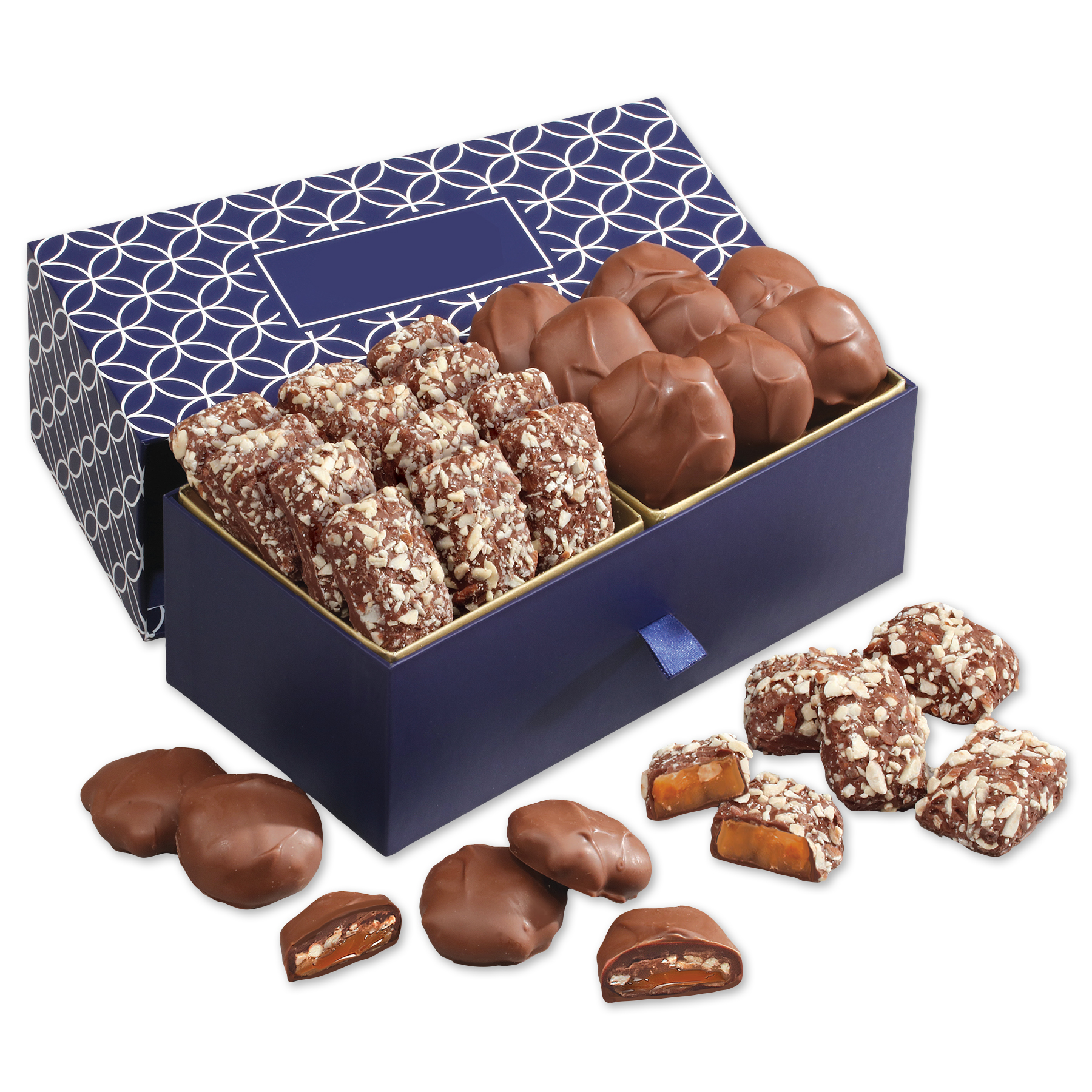 Equally attractive for an office or home, this navy and white patterned drawer box is sure to be used again and again! Pull open the drawer by its ribbon tab to reveal eight mouth-watering caramel pecan clusters, one-quarter pound, and twelve pieces of irresistible butter toffee, five-ounces. For the final touch, we imprint the top of the box with your logo in your choice of color for an impression your recipients won’t soon forget. Complies with CPSIA, FDA, Prop 65. 7.5″ L x 3.875″ W x 2.5″ H
