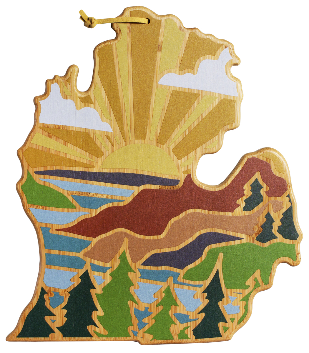 Celebrate life in The Great Lakes State with the Michigan State Shaped Cutting Board with Artwork by Summer Stokes. This Michigan Mitten shaped board features beautiful landscape art by artist Summer Stokes. It’s a fun way to add a bit of “local flavor” to your next charcuterie or grazing board. Before serving, flip the board over for use as a knife-friendly bamboo chopping board on the blank back side. When not in use, the included hang tie allows the board to easily double as wall art. 11 3/4″ W x 13 1/4″ H x 5/8″ Thick