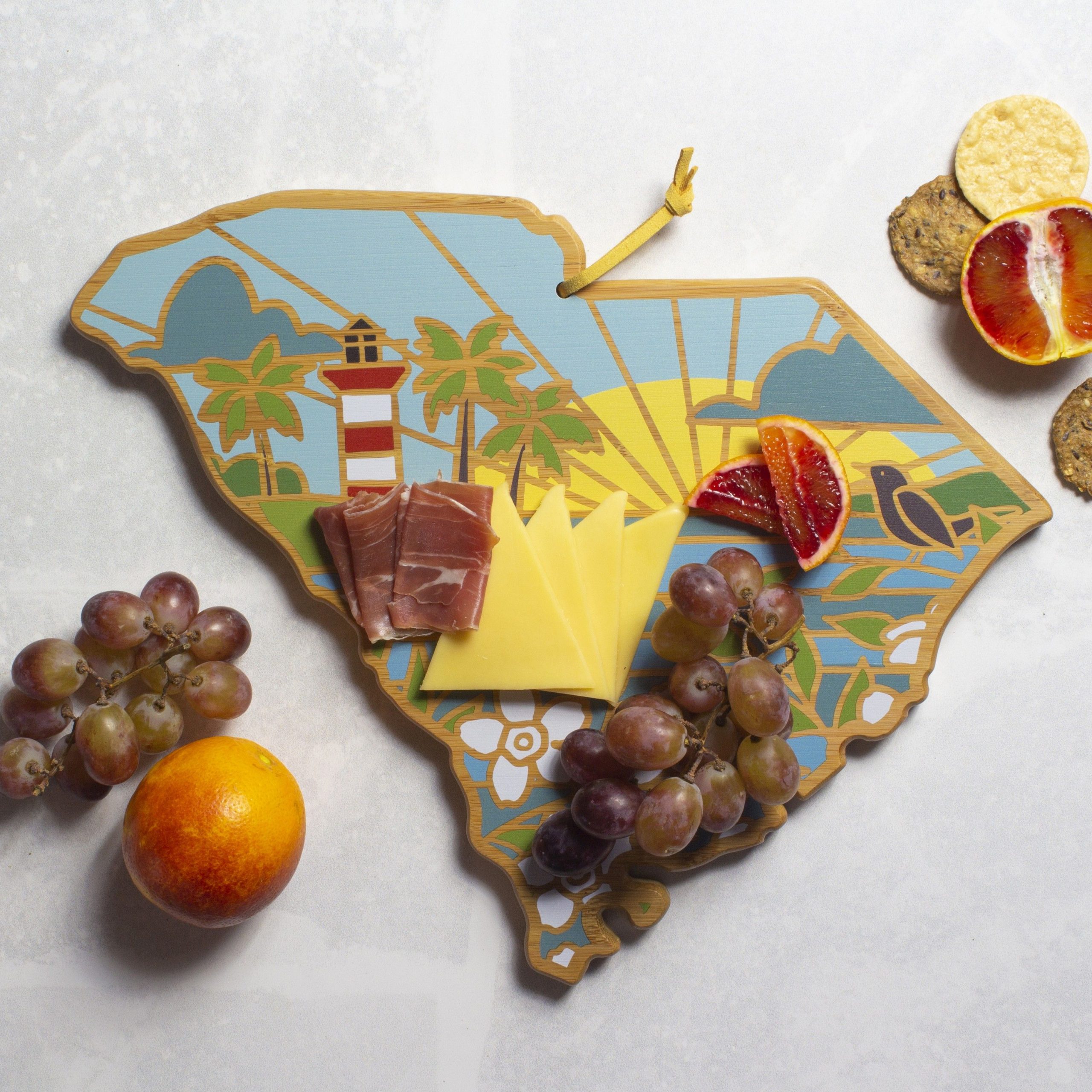 Celebrate life in The Palmetto State with the South Carolina State Shaped Cutting Board with Artwork by Summer Stokes. This South Carolina shaped board features beautiful landscape art by artist Summer Stokes. It’s a fun way to add a bit of “local flavor” to your next charcuterie or grazing board. Before serving, flip the board over for use as a knife-friendly bamboo chopping board on the blank back side. When not in use, the included hang tie allows the board to easily double as wall art. 14″ L x 11 1/2″ W x 5/8″ Thick