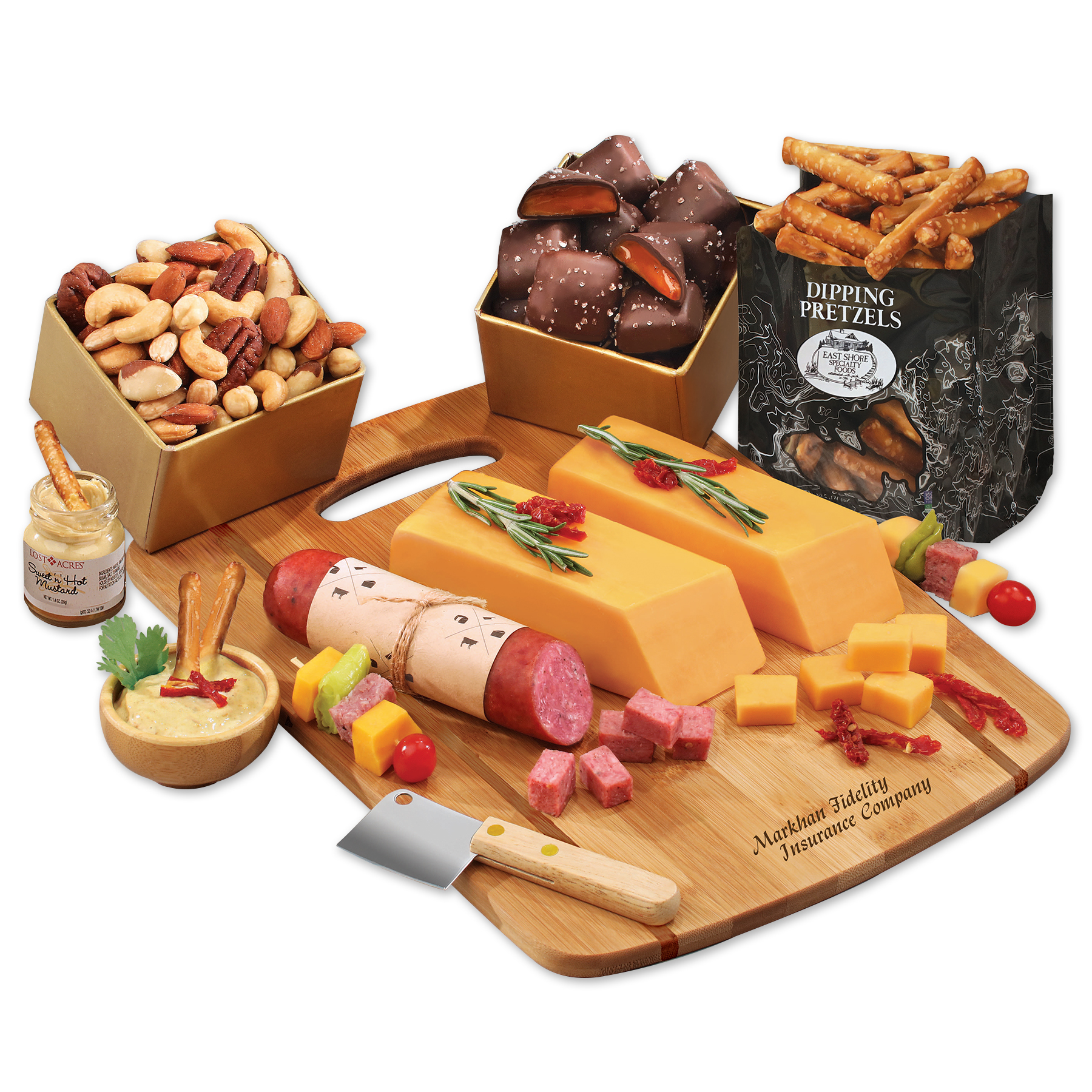 We pack this sleek bamboo charcuterie board with something for everyone! Two blocks of Wisconsin cheddar cheese come with sweet, salty, and savory goodness, sure to satisfy even the most discriminating of snackers. Recipients will use the sustainable bamboo board—firebranded with your logo—again and again. Complies with CPSIA, FDA, Prop 65. 13″ L x 9.5″ W x 0.375″ H